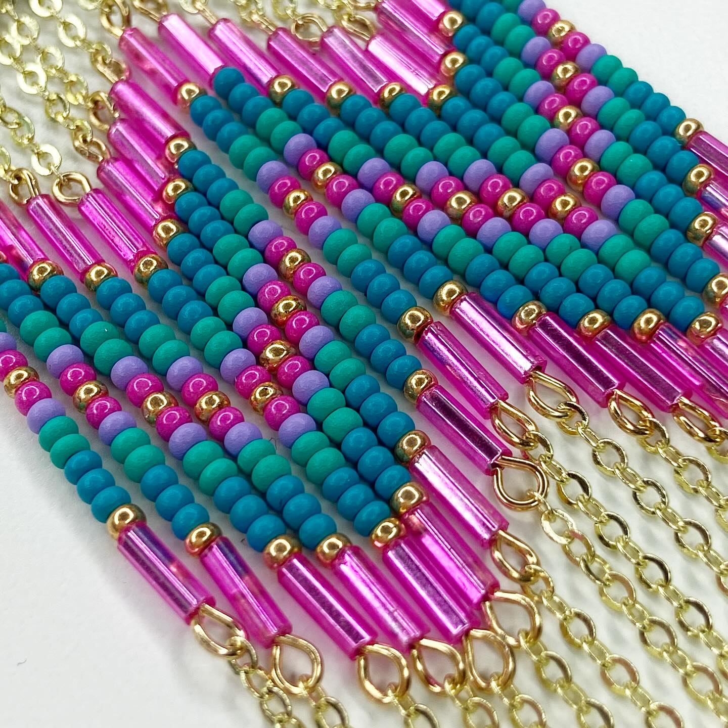 - Hand-beaded with chain accents