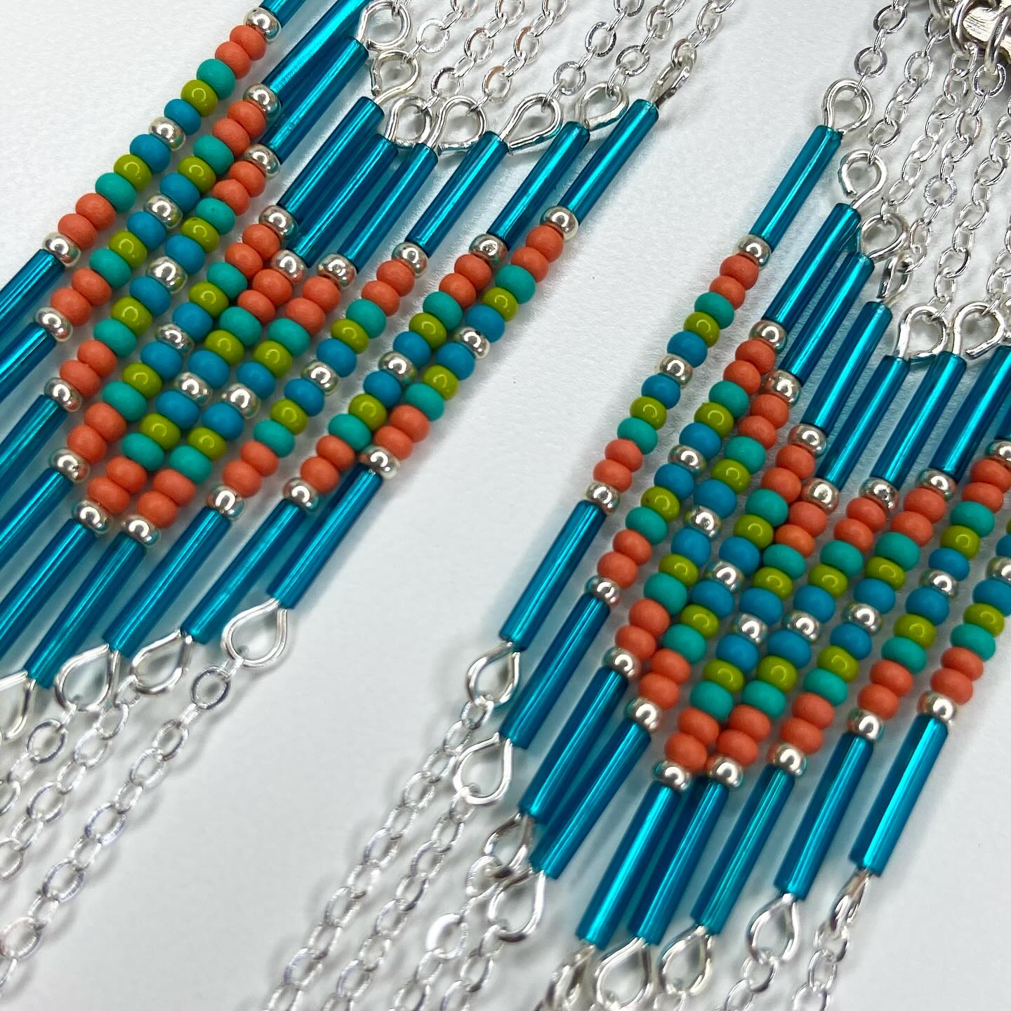 • Hand-beaded with chain accents